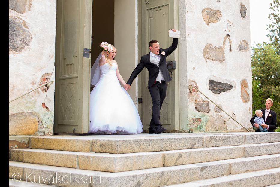 Vieraiden tultua ulos ja asetuttua vastaanottamaan tuore aviopari, on virallinen tilaisuus päätöksessään ja viimeistään tässävaiheessa tulee aitoja onnen ja helpotuksen hymyjä kuvattavaksi.